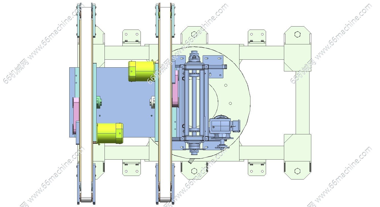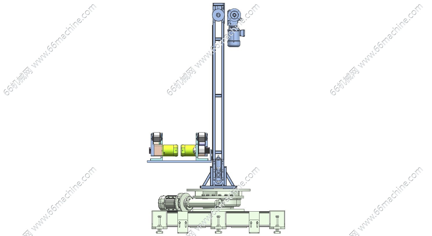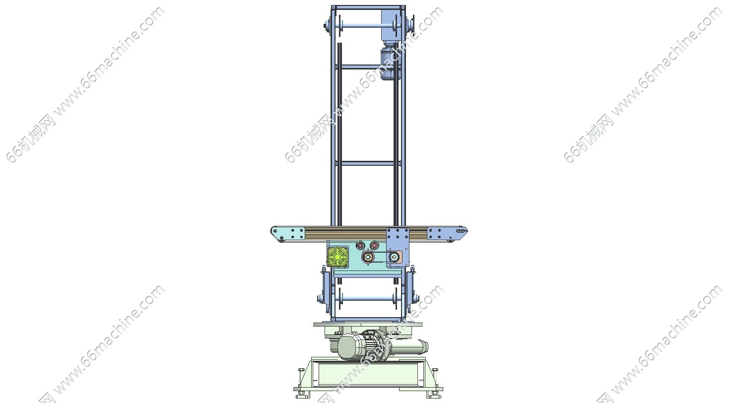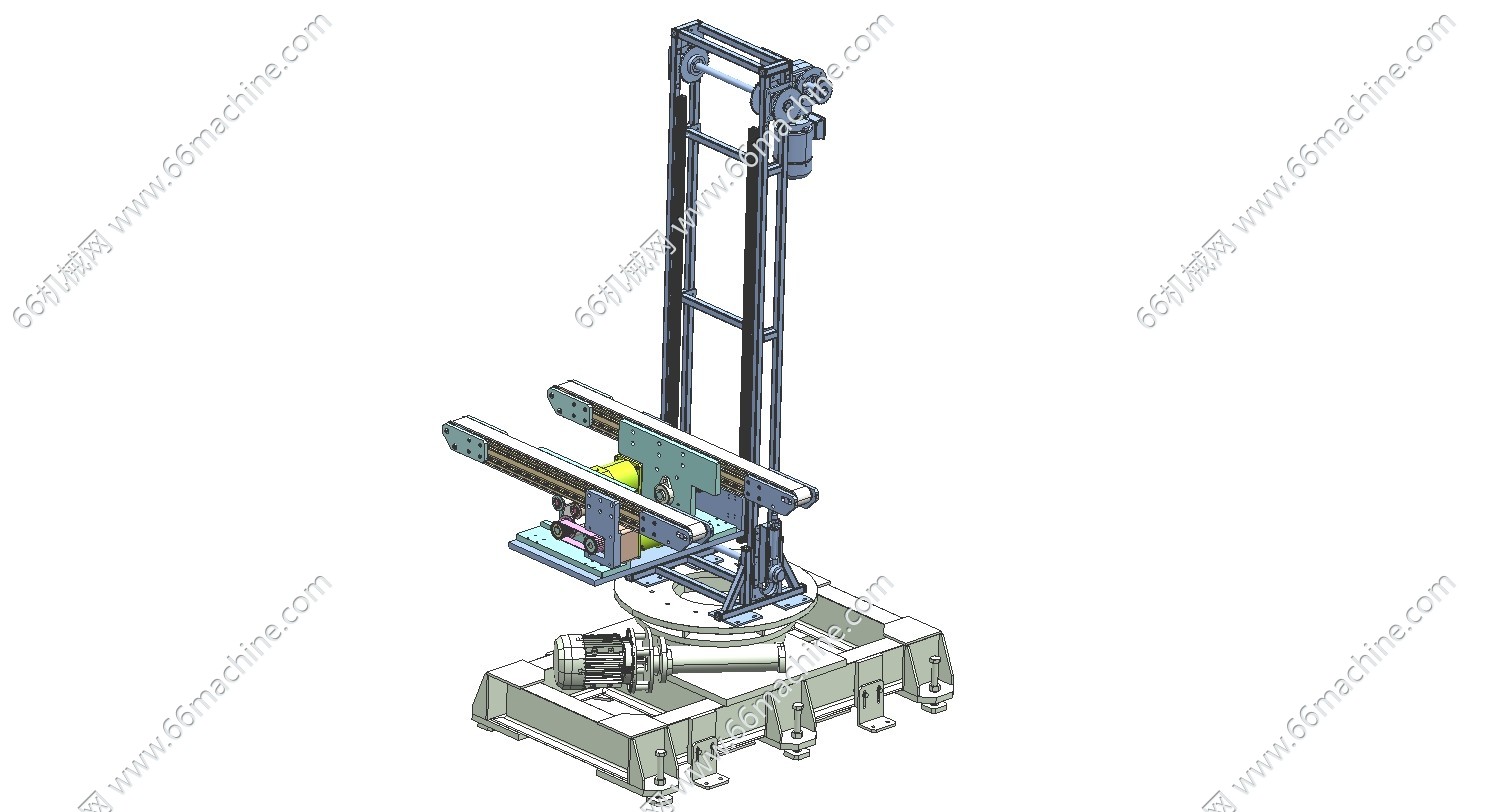 本份图纸为举升旋转接驳机,链条举升配重后能托举高负载的重量,前面设计有中间输送机,实现载盘前后和上下的托运,底部为大型变位机。框架为方钢焊接,稳定牢固可靠。本图纸为通用格式,不含参数。