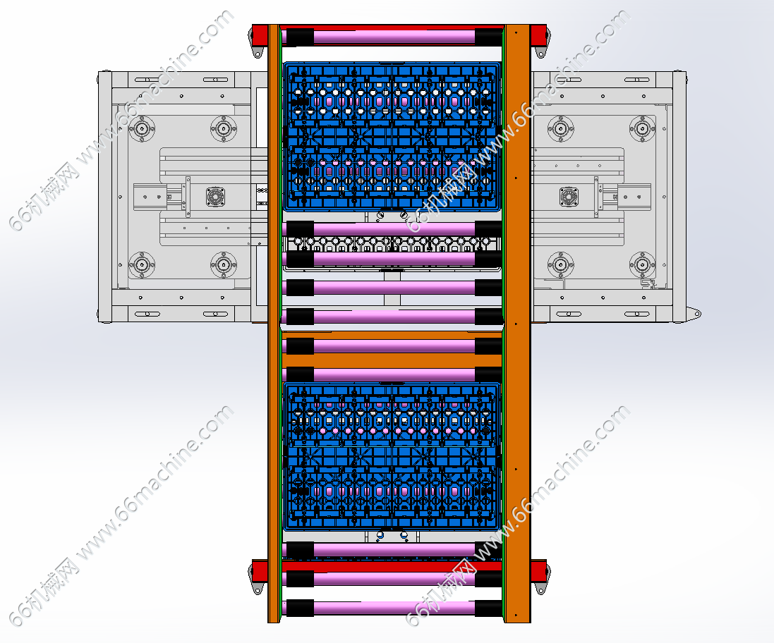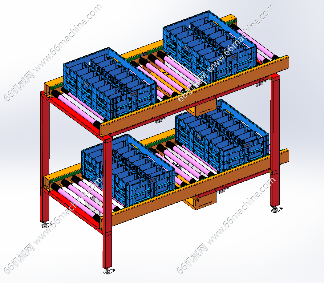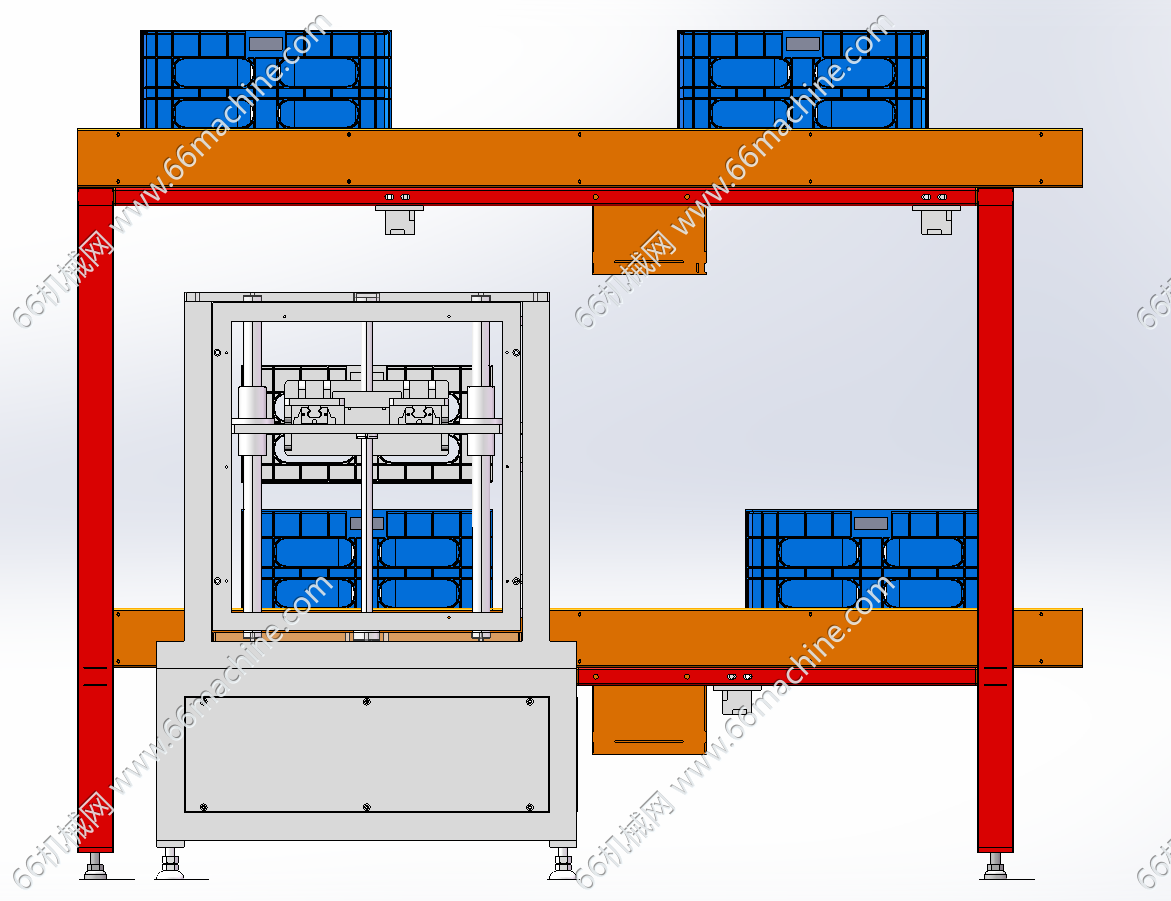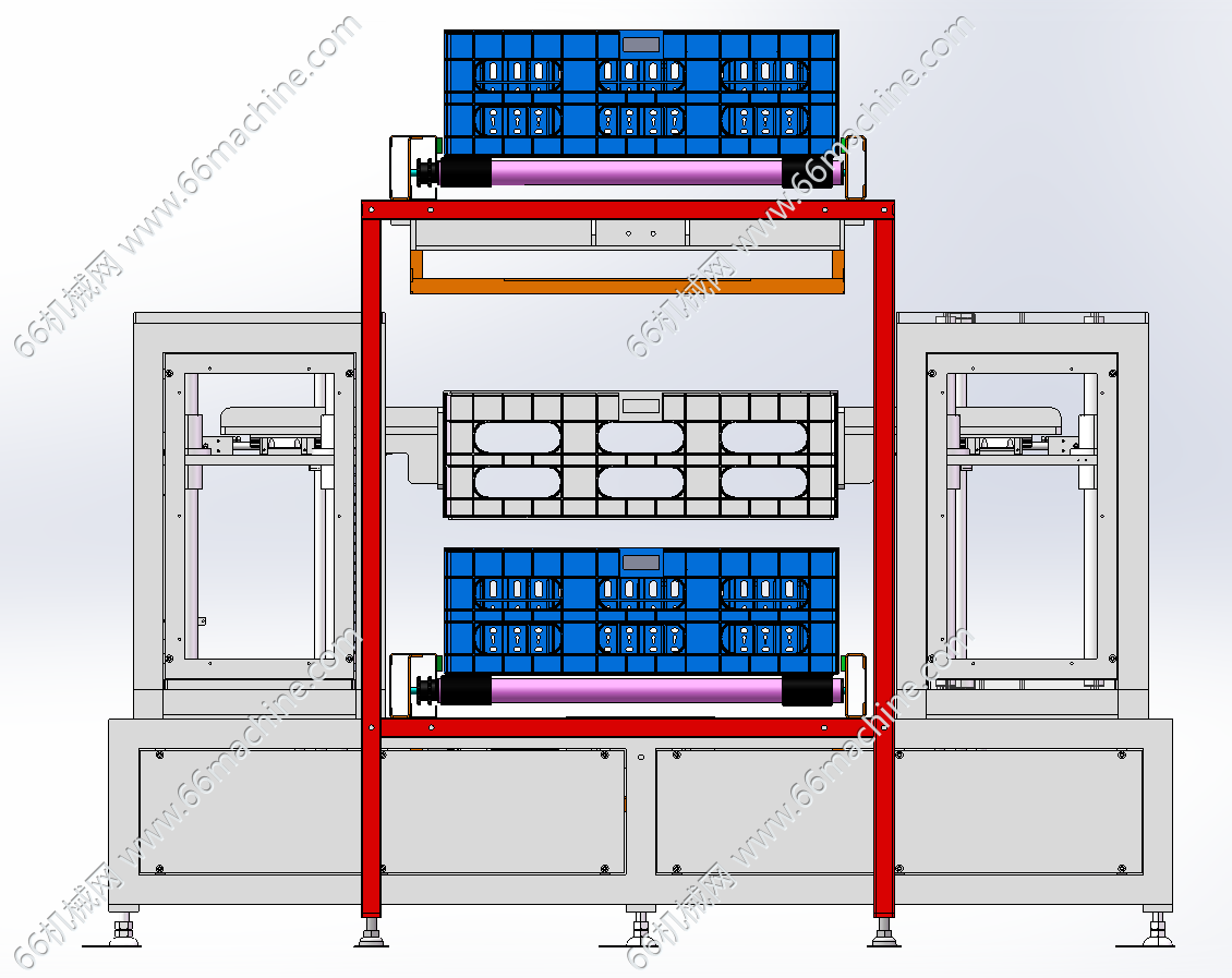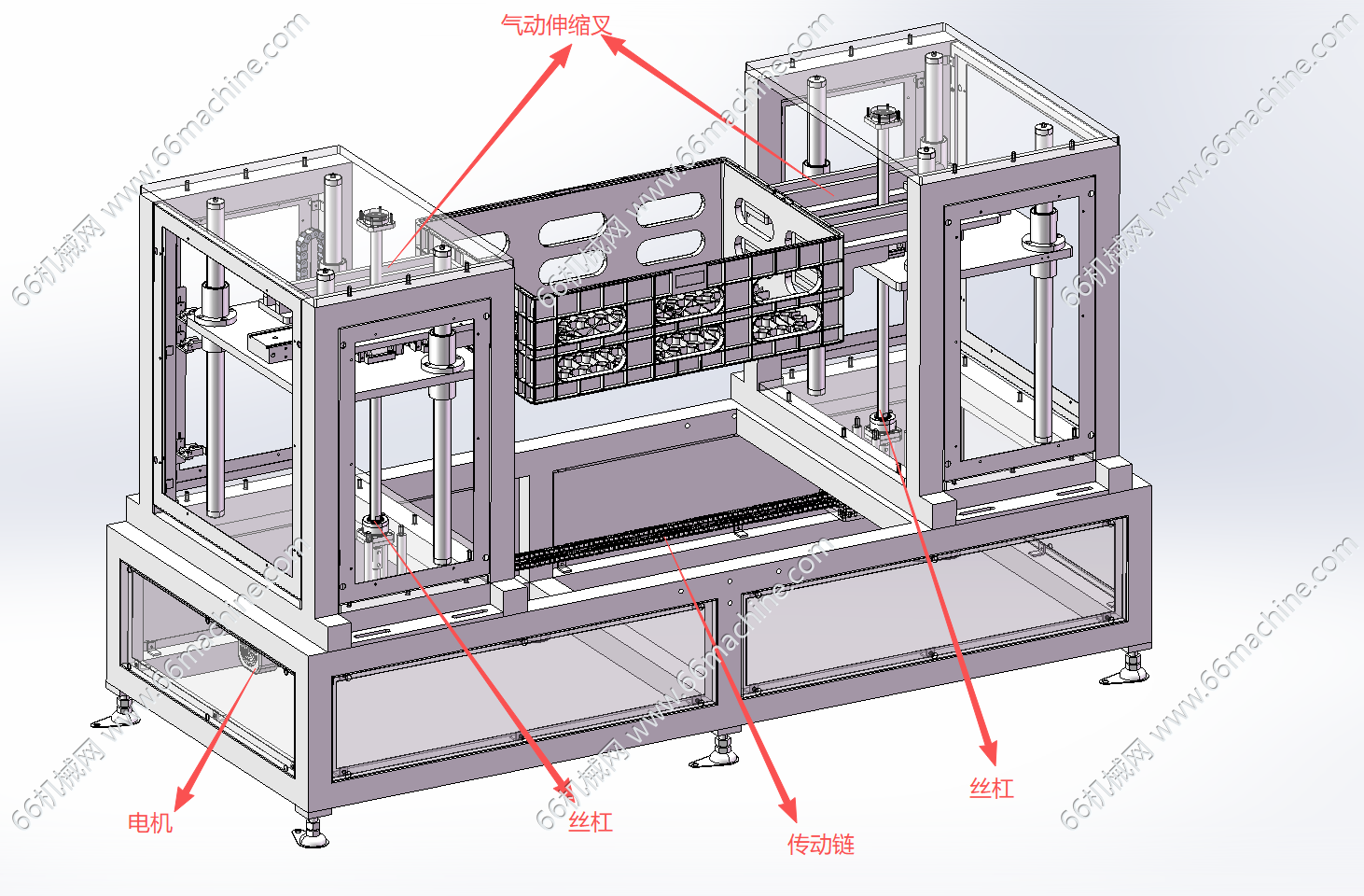 本模型为电芯框拆分机(拆盘机),主要由升降式拆盘机及双层滚筒线组成,升降式拆盘机采用电机+丝杠驱动升降(2组丝杠升降模组),气动伸缩叉叉取电芯框实现电芯框拆分,欢迎参考!