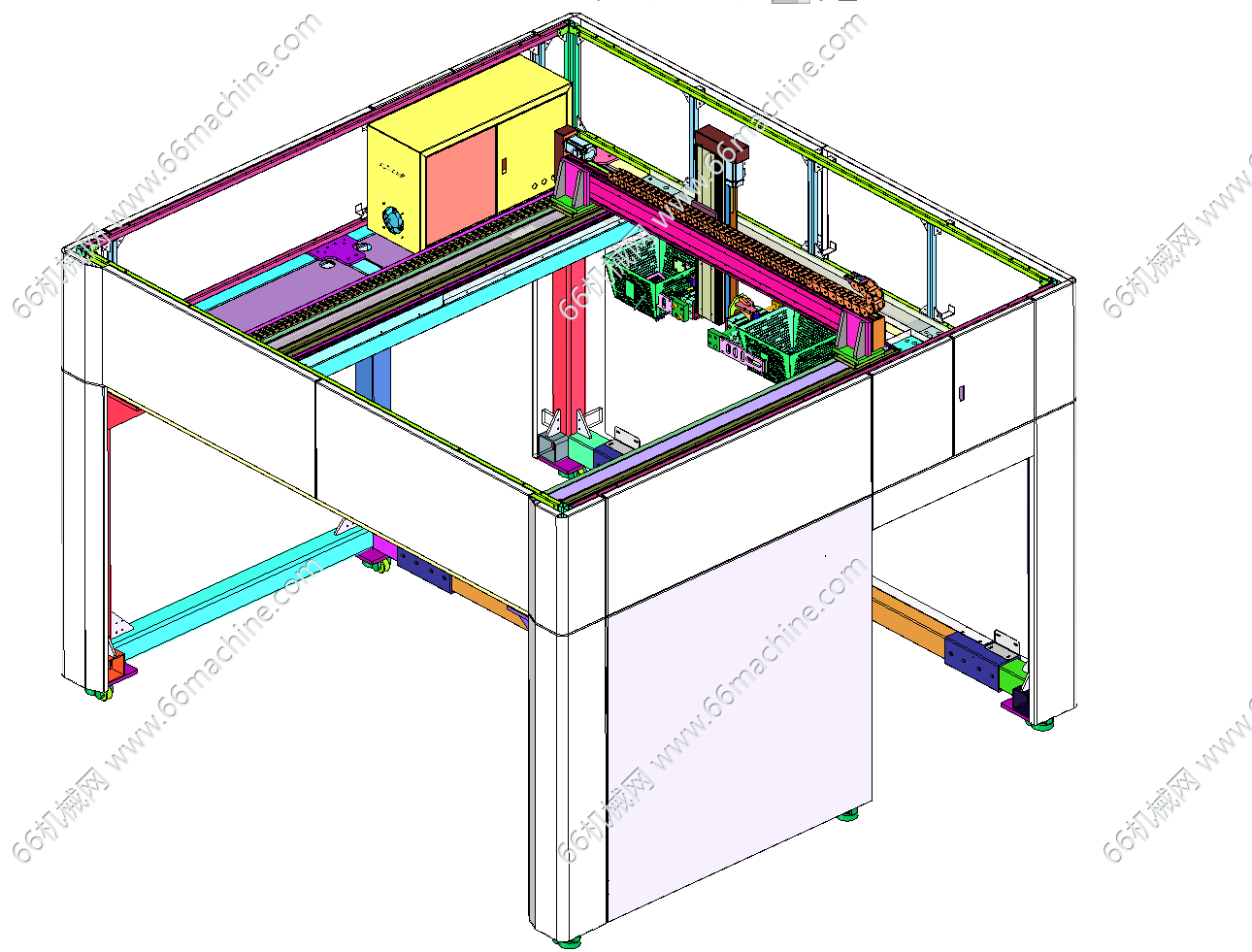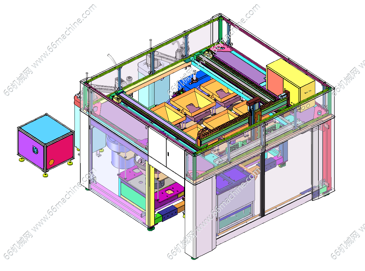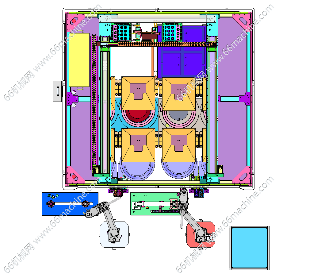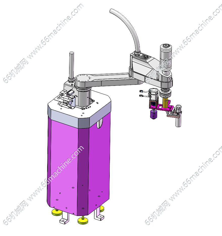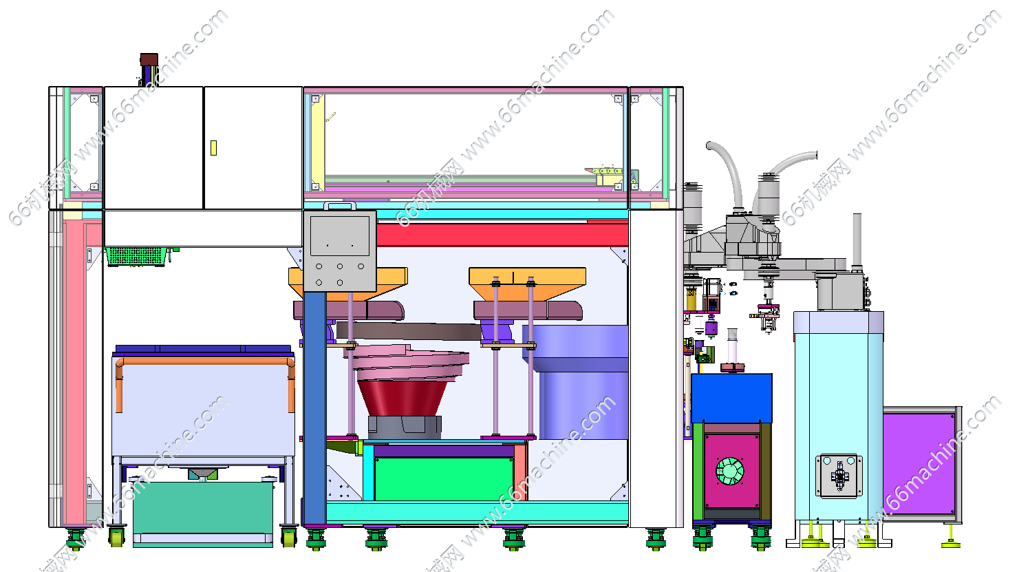 本模型为某企业瓶体、泵盖及外盖组装机,主要由四轴组装机器人、振动盘及直振出料模组、组装台、机架及篮子三轴桁架移送机构等组成,三轴桁架移送机构将部件放入振动盘,然后振动盘供料,机器人进行组装。该设备主要用于化妆品瓶体、泵盖及外盖组装作业,仅供大家参考!!