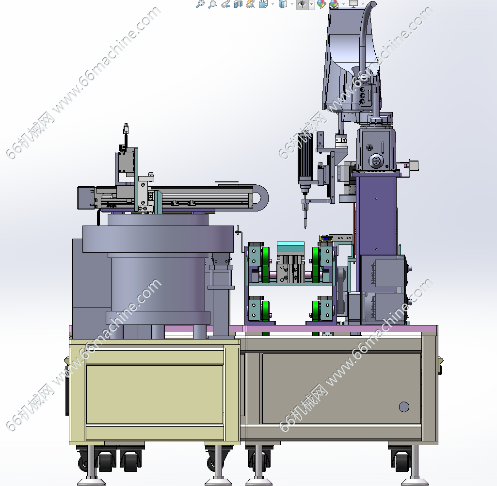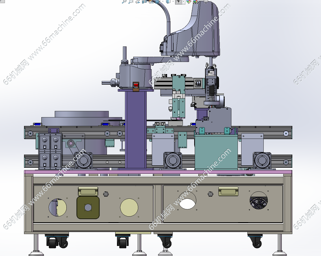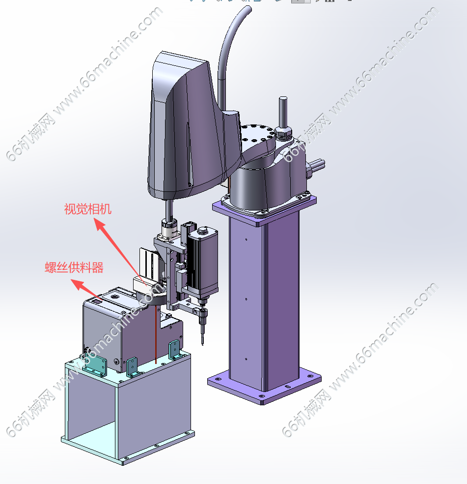 本模型为基于四轴机械手的锁螺丝机,主要由下机架、机罩、载具输送线、视觉引导四轴锁螺丝机器人、振动盘供料模组、工件移栽模组等组成,主要用于载具上工件的螺丝锁付作业,通用性强,欢迎参考!