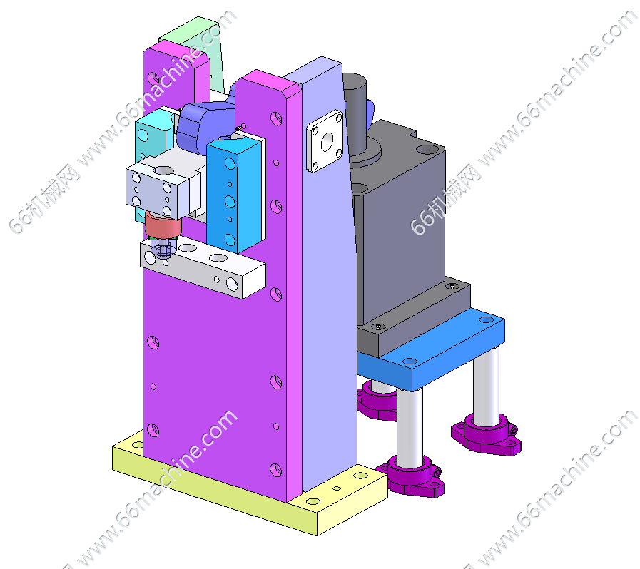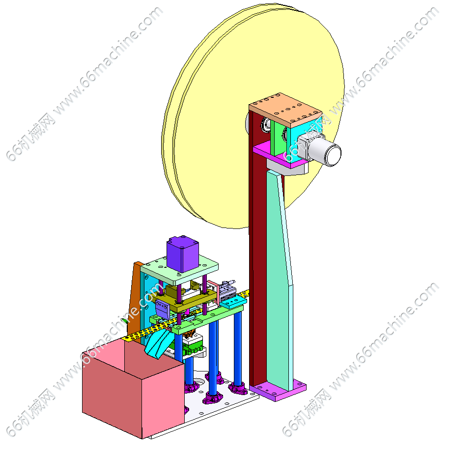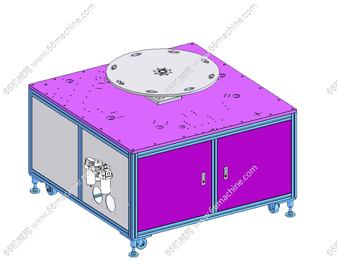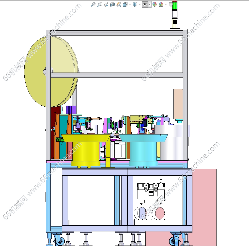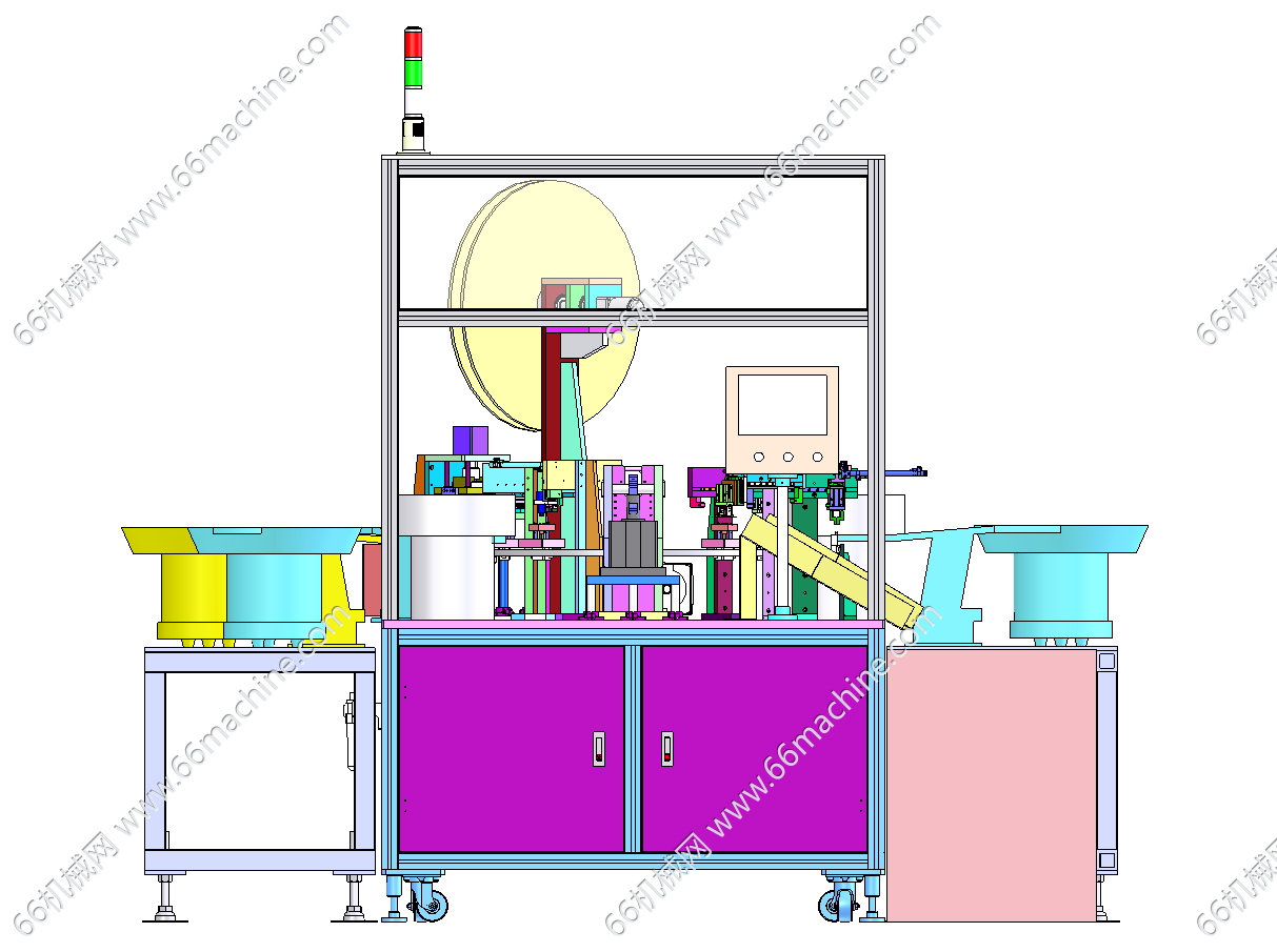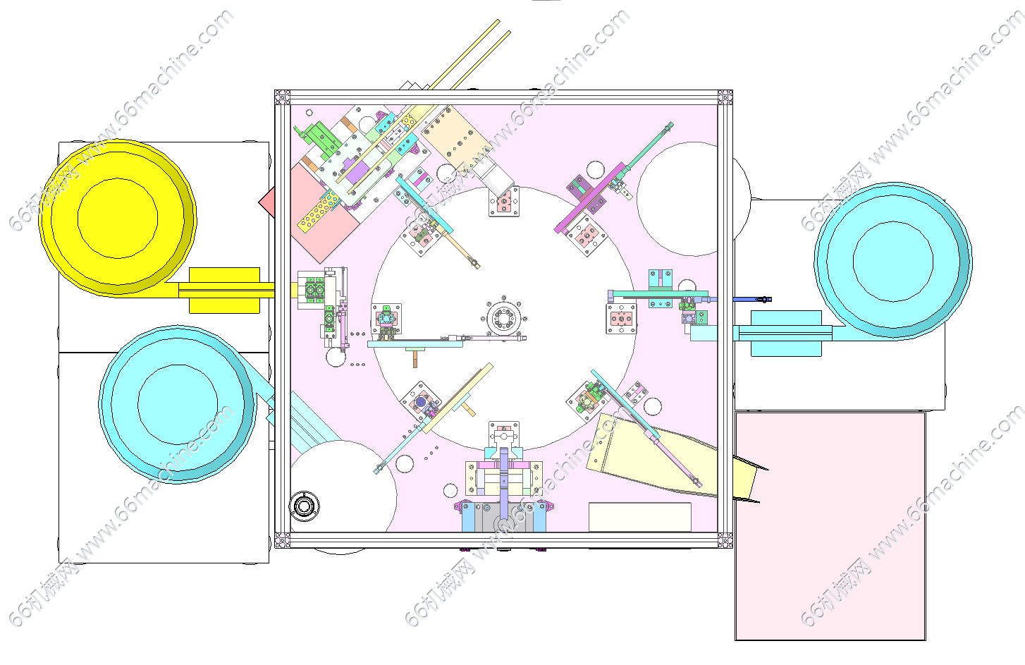 本模型为某企业波形圈与盖板架转盘式多工位组装机,通过卷料放料冲切波形圈,由搬运机构搬运到转到安装工位,对应的其它匹配的装配部件则由振动盘震动到直震上,搬运机构把直震上的物料搬运到转盘对应的工位,安装机构对每个工位的物料安装,待安装完后,流到最后一个工位顺着滑动流出收集箱。欢迎下载参考!
