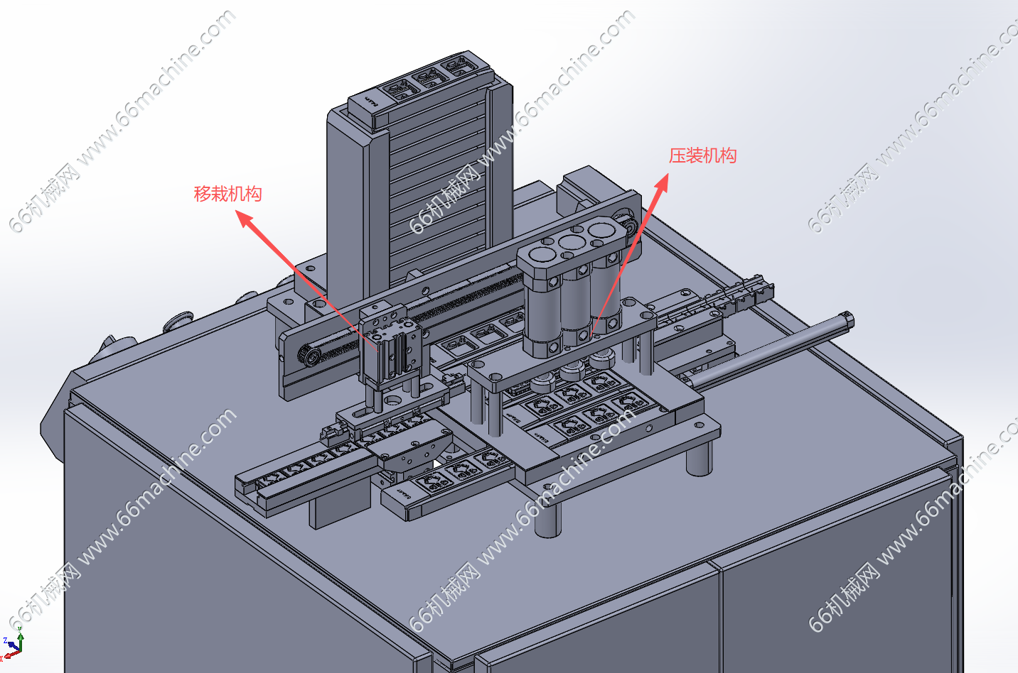 本模型为非标插座组装设备,主要包括机架、料仓自动上料机构、移栽机构、气动压装机构等组成,实现插座部件的自动上料及组装作业,可以参考其设计思路!