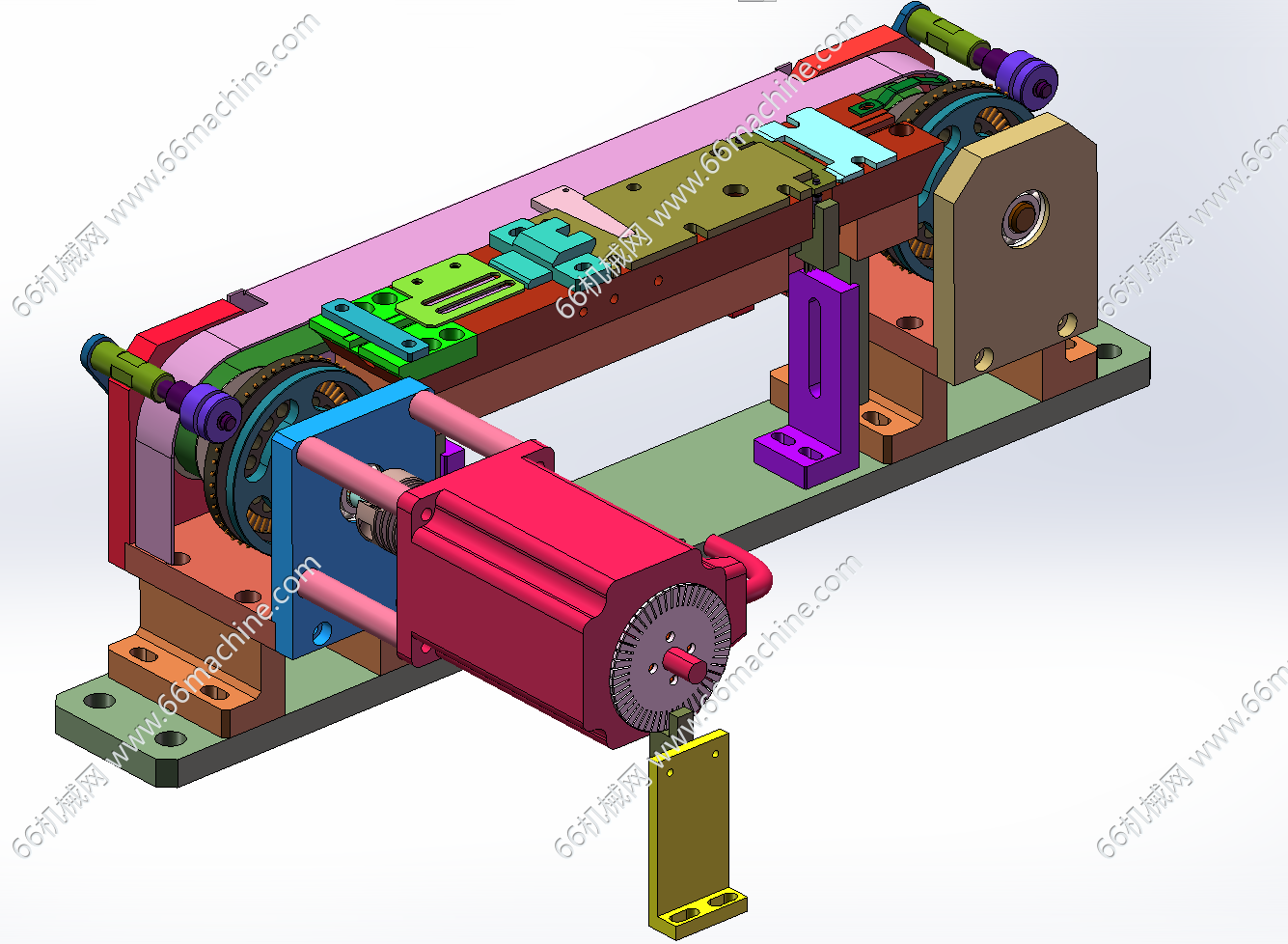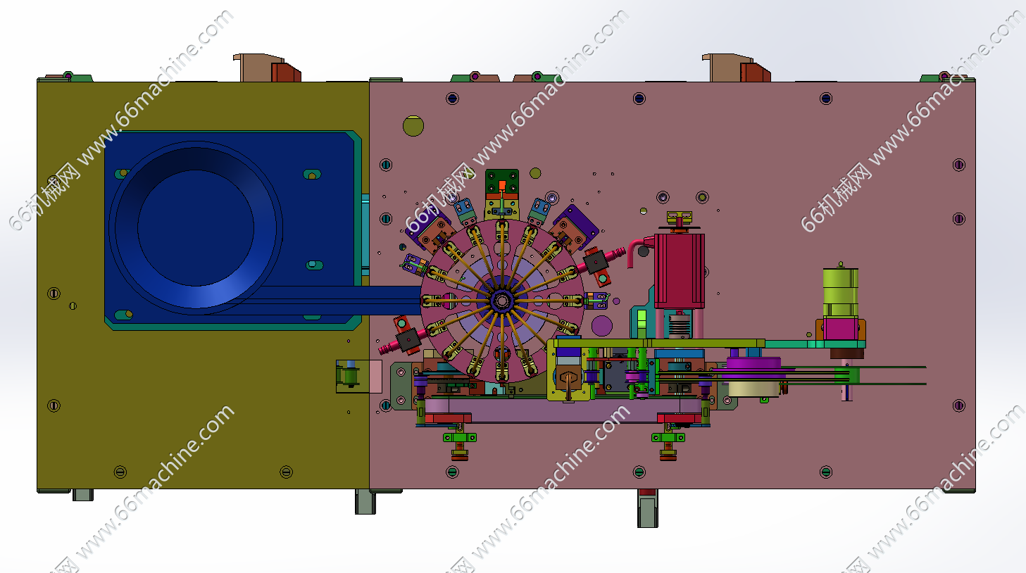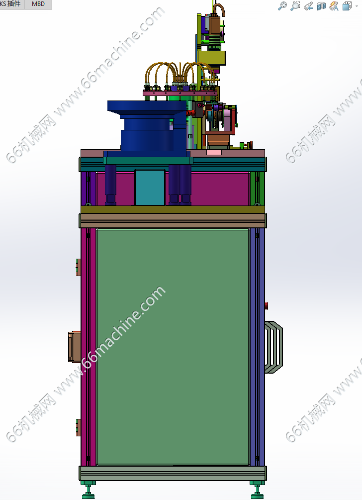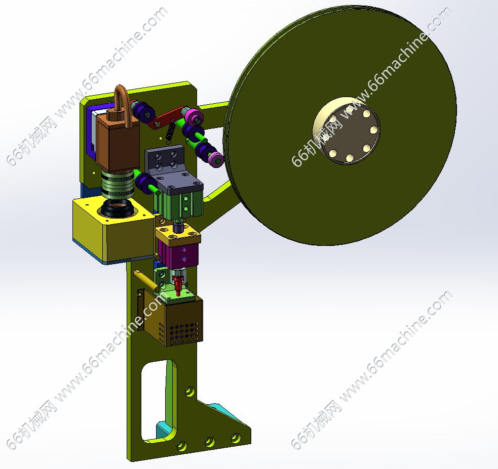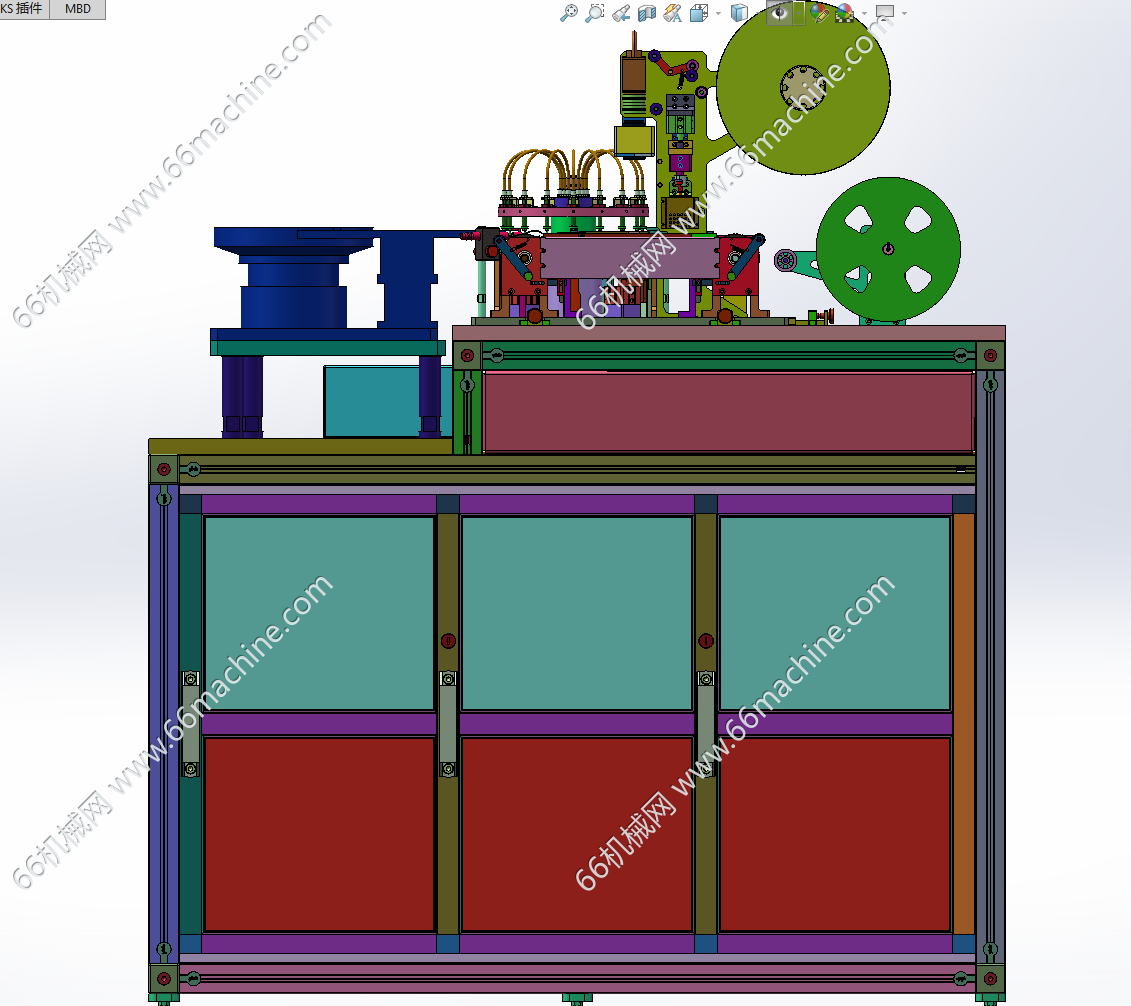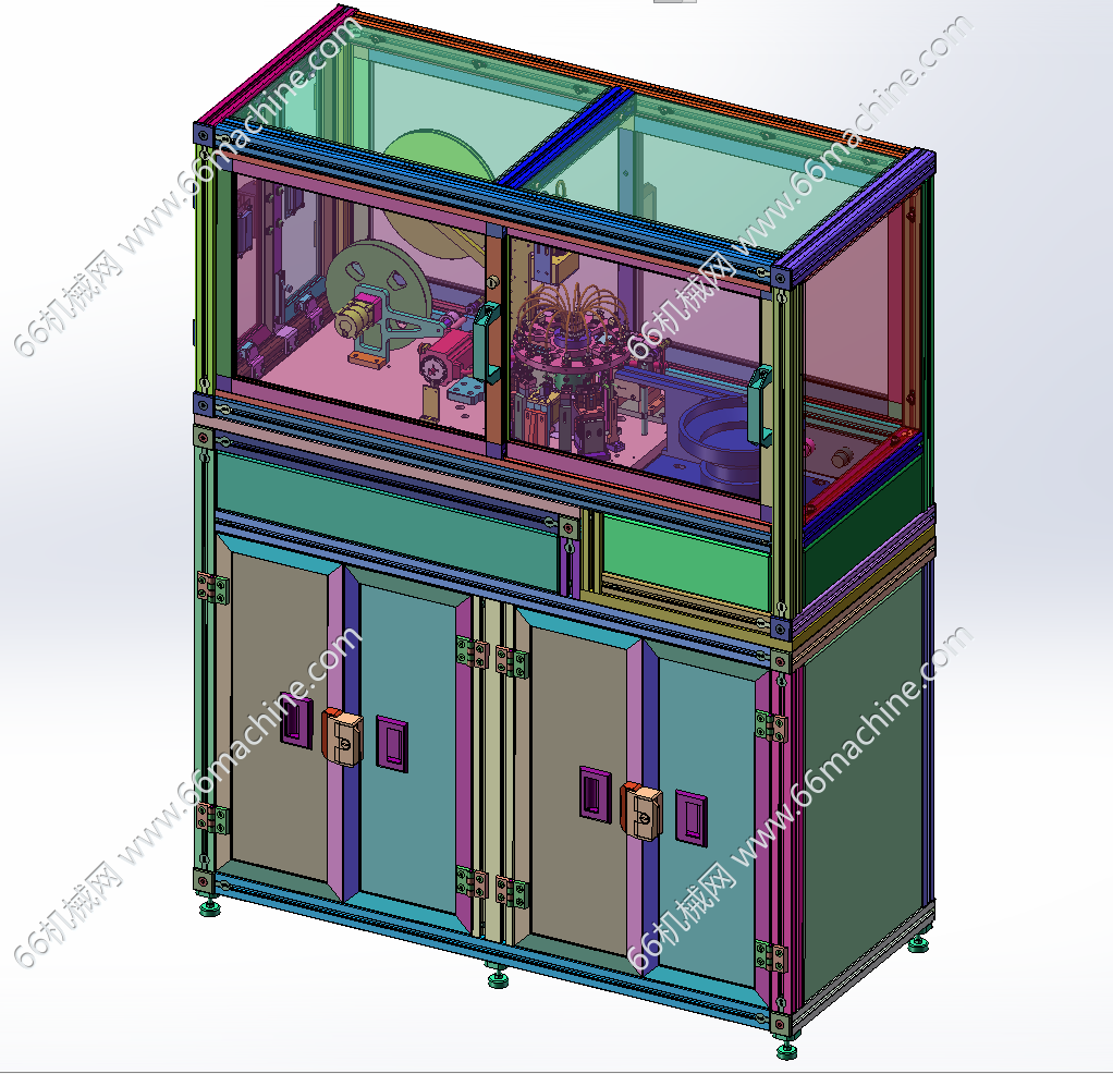 本模型为LED灯带装配机,主要由下机架、机罩、旋转吸嘴模组、压带支架、编带输送模组及收带模组等组成,振动盘自动完成上料,工位间导带传送,可实现自动工作。仅供大家参考!