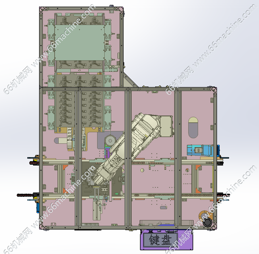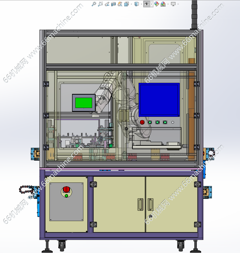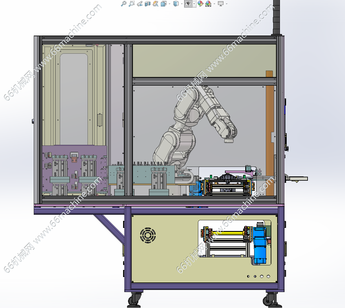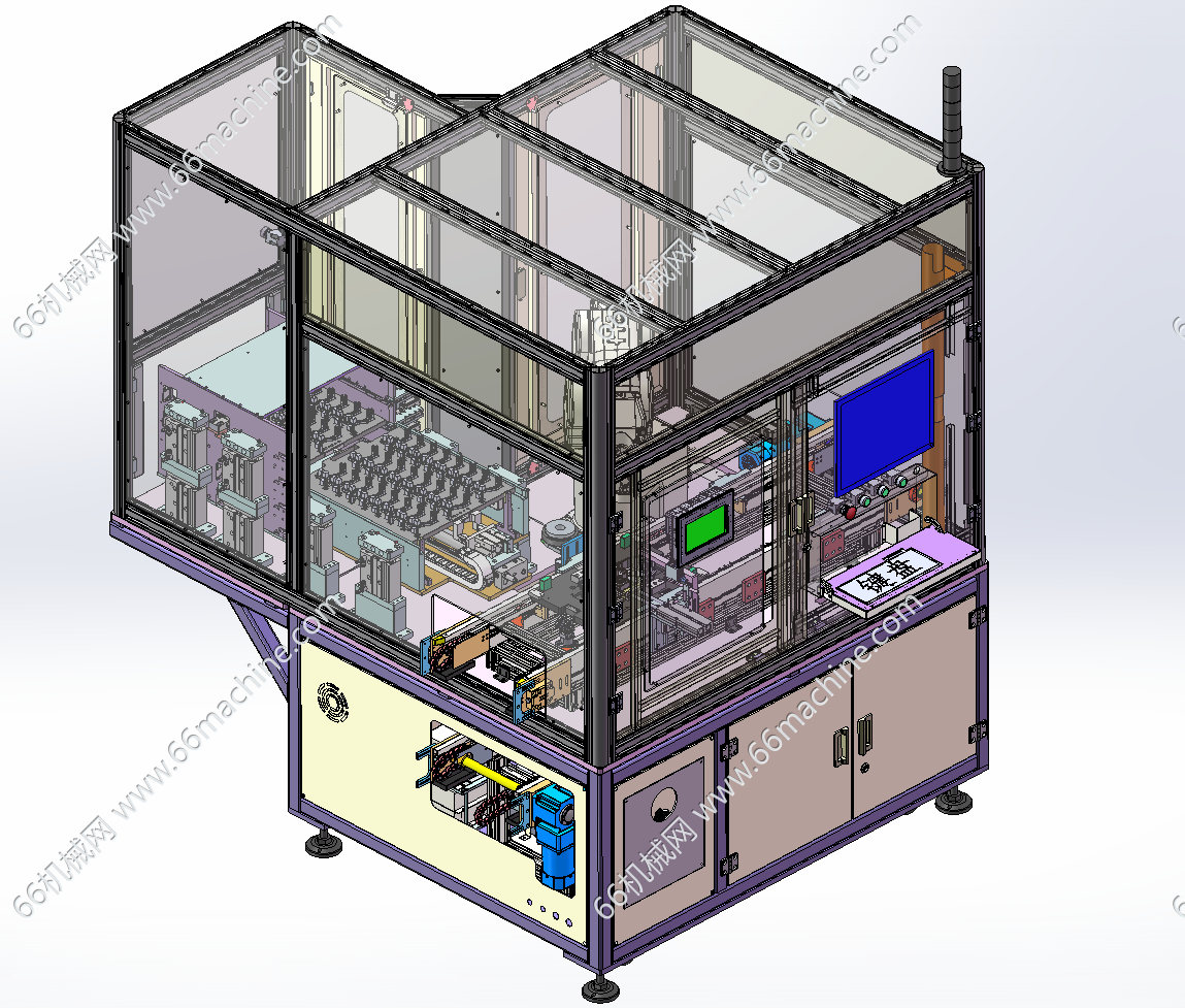 本模型为某企业线盒内连接排自动组装机,主要由下机架、机罩、六轴组装机器人、载具输送线、连接排供料机等组成,线盒放入载具内沿着输送线流入,机器人从供料机内抓取连接排装入线盒内,仅供大家参考!