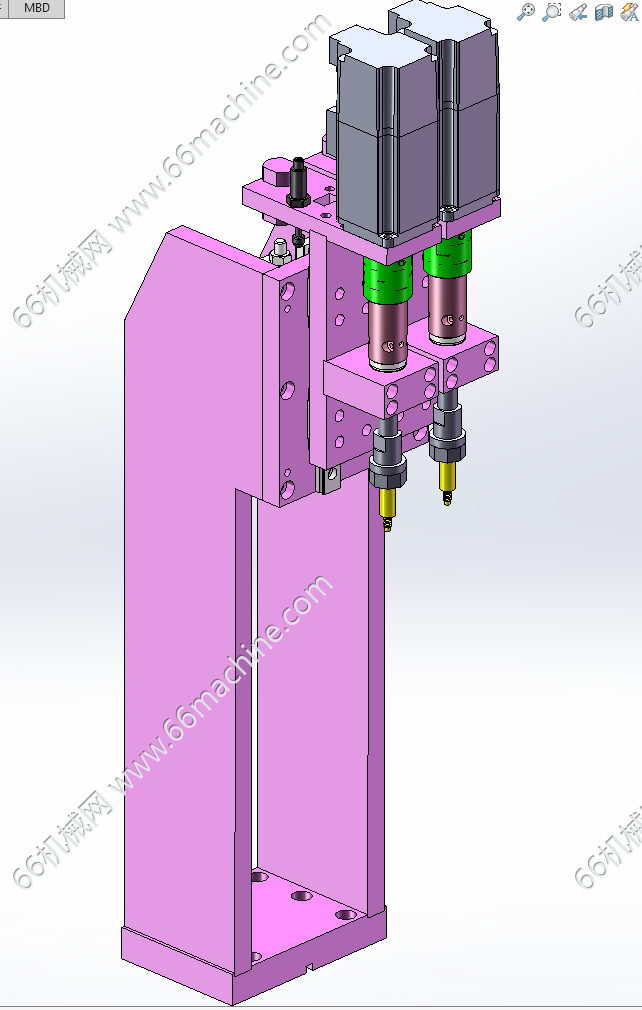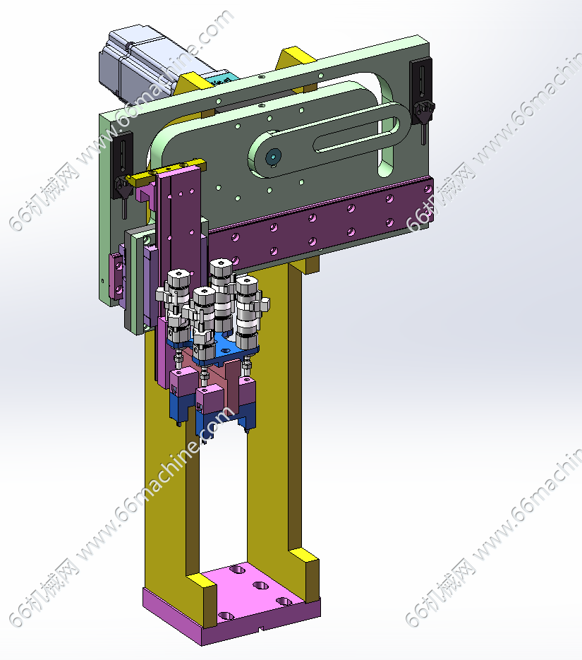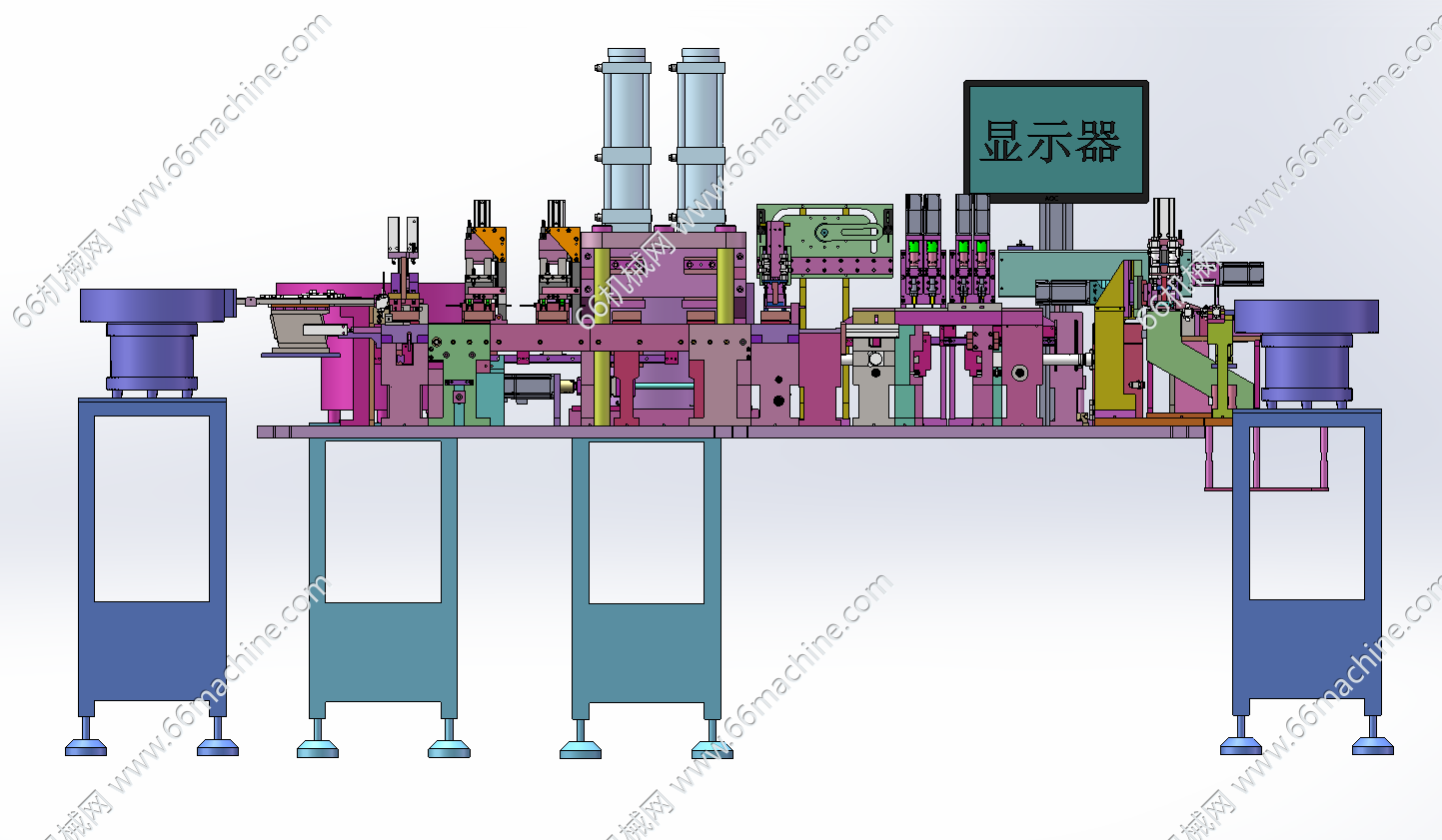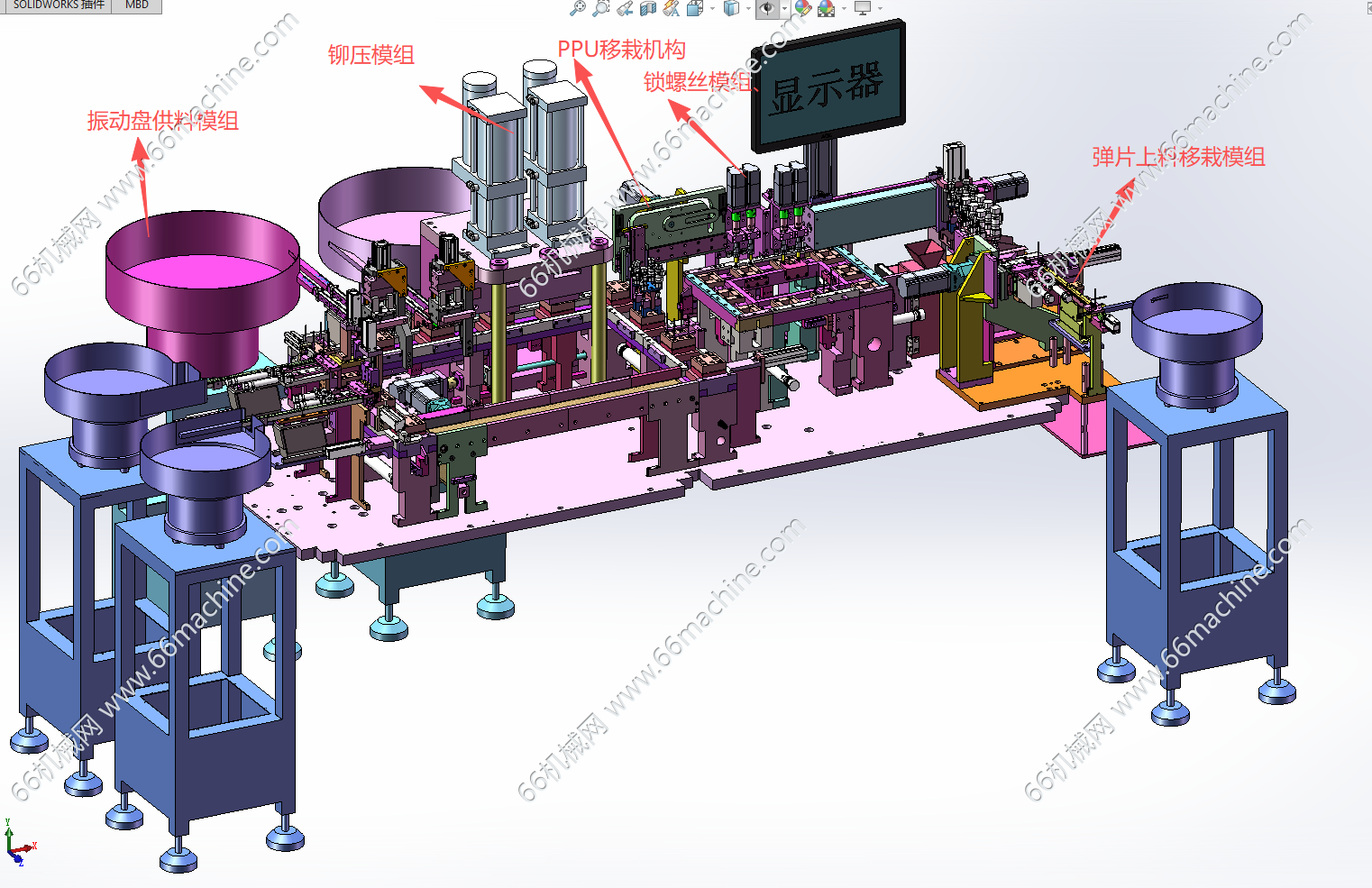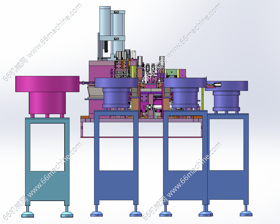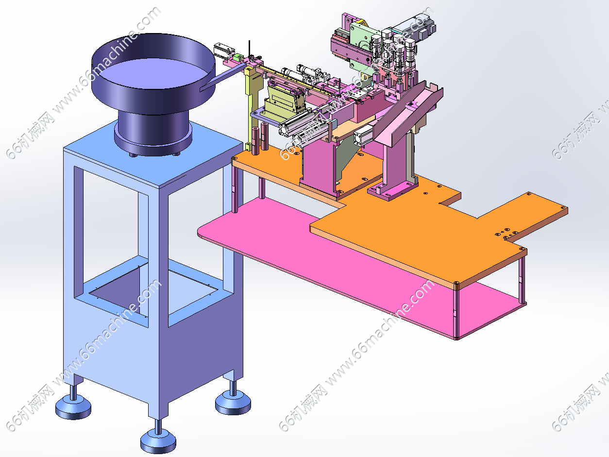 本模型为某企业自动铆压弹片、锁螺丝一体机,主要由下机架、机罩、振动盘供料模组、移栽下料模组、锁螺丝模组、铆压模组、弹片上料移栽模组等组成,用于将弹片铆压至工件上并进行螺丝锁付作业,欢迎参考!