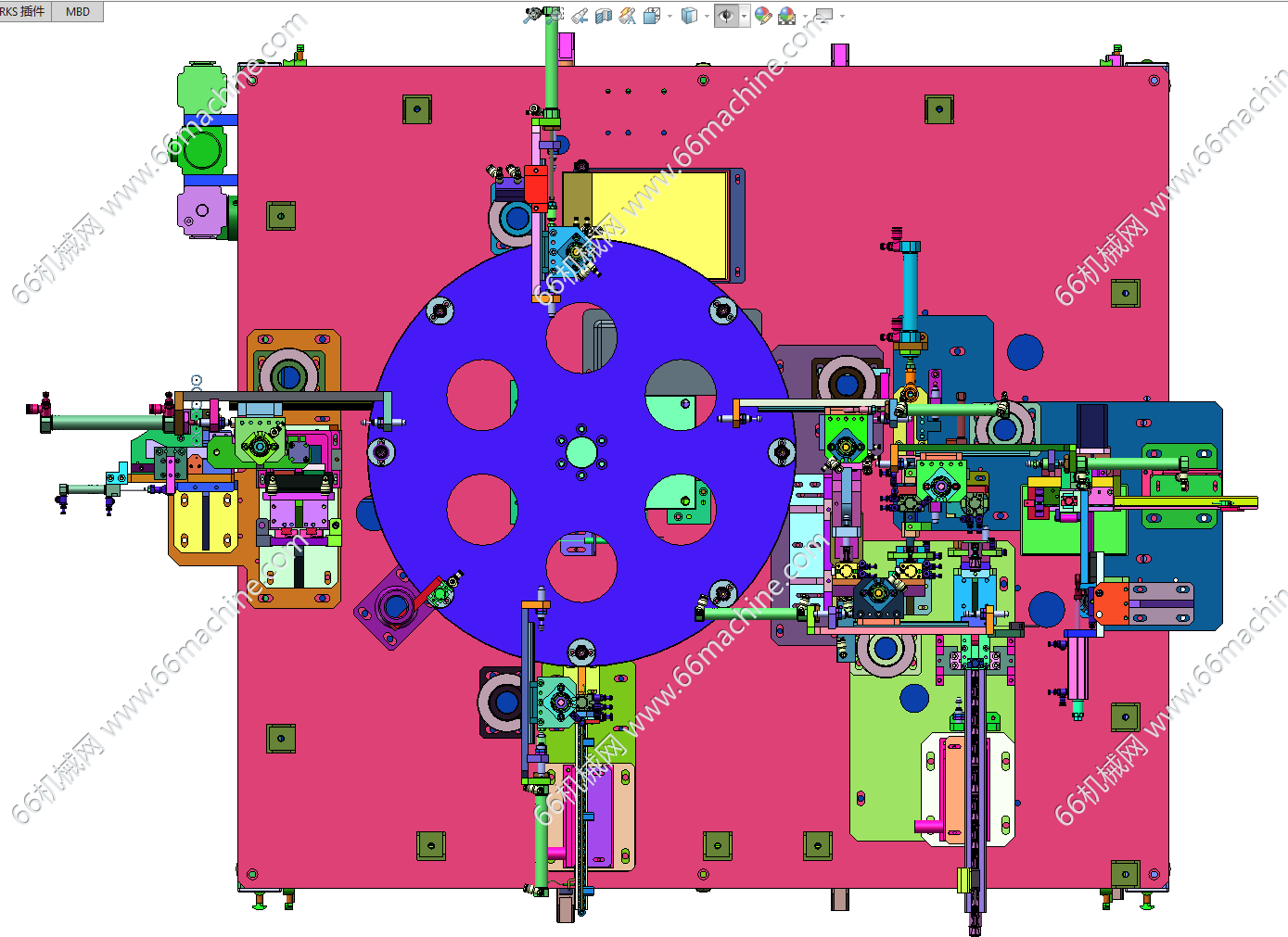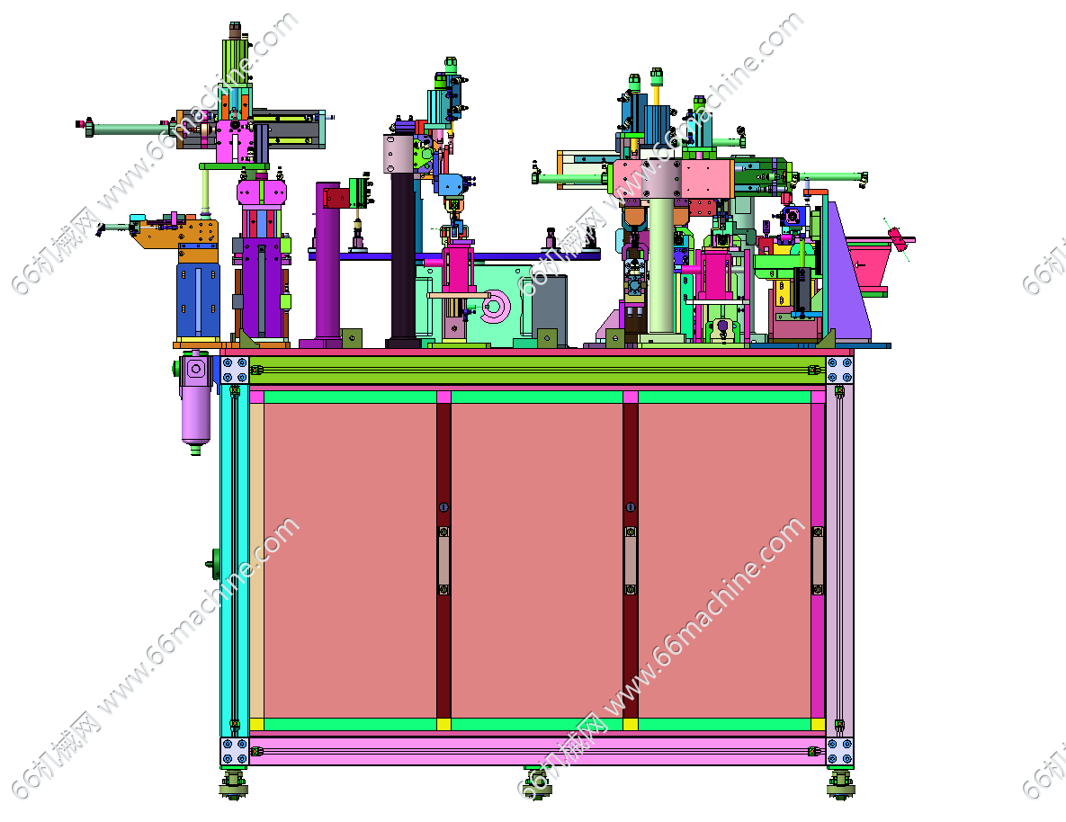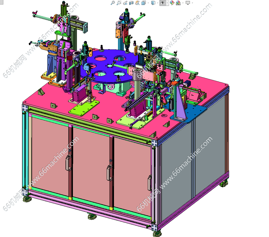 本模型为压力阀组装机,主要由下机架、机罩、多工位转盘、零部件夹取移送模组等组成,工位间利用分度盘进行传递,零部件采用自动上料及组装作业,可供大家参考!