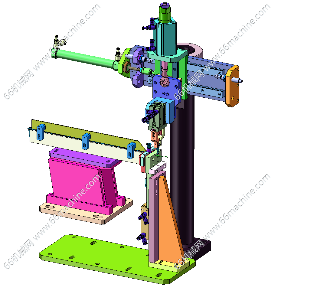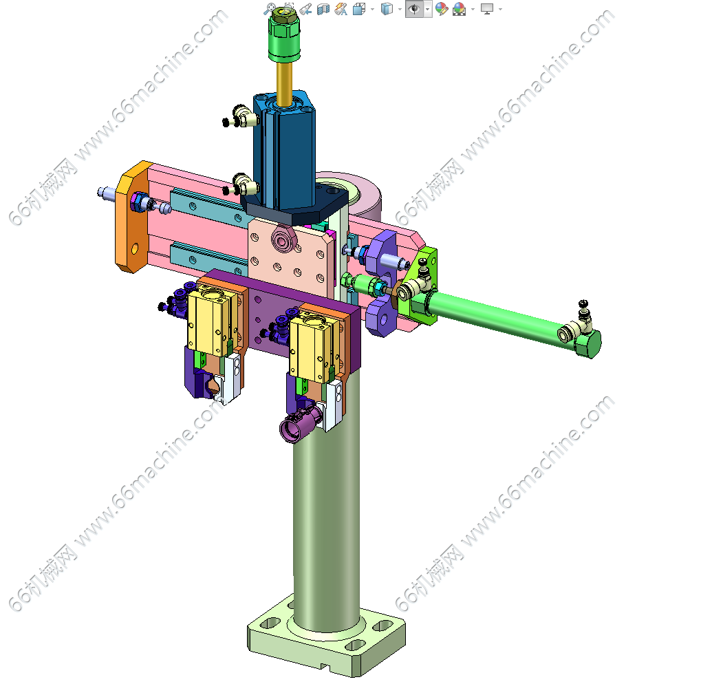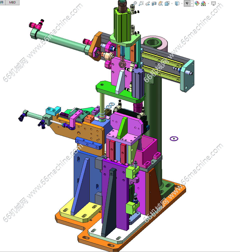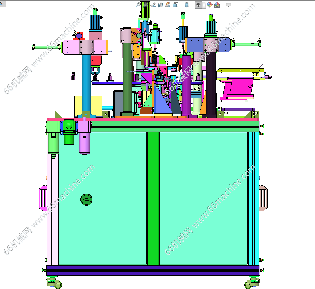 本模型为压力阀组装机,主要由下机架、机罩、多工位转盘、零部件夹取移送模组等组成,工位间利用分度盘进行传递,零部件采用自动上料及组装作业,可供大家参考!